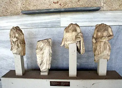 The Athena and Ares might have stood at the end of the cella as the main cult images of the sanctuary, perhaps flanked by the two images of Aphrodite mentioned by Pausanias.[126] These have been identified with two female torsos (inv. S 1882 and S 378) found in the post-Herulian wall with architectural fragments of the temple.[127][128] These statues are on the same scale and mirror each other, since the first rests her weight on her right foot, holds something (probably a sceptre) in her left hand, and leans left, while the latter rests her weight on her left foot, leans right and could have held a sceptre in her (lost) right hand.[129] The former is a classical statue from around 420 BC, probably made by "Master A", one of the sculptors who worked on the parapet of the Temple of Athena Nike.[130] The latter dates to the third century BC and is probably the statue of Aphrodite Hegemone from the Sanctuary of the People and the Graces.[125][131] In the Augustan context, the statue of Ares would have been linked with Augustus' patron Mars Ultor, the Athena with Minerva, and the two statues of Aphrodite with Venus as ancestor of Augustus' family, the Gens Julia.[24]