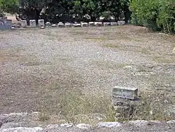 There is another terrace in front of the temple, extending 8.25 metres to the east.[32] The central area, directly in front of the temple was paved with Hymettan marble slabs.[33][32] About ten metres east of the temple, in this paved area, there was a large altar,[35] measuring 5.62 metres from east to west and 8.30 metres from north to south. The eastern part is the podium where animals were sacrificed; the western part is a stair case, 2.12 metres long and 7.00 metres wide.[36] It was probably the same height as the stylobate of the temple.[36] A set of orthostates with stone shields carved in relief may have run around the edge of the altar. There was an inscription on a band above them (Ag. I 6634), but it is too fragmentary to read.[37] They were subsequently reused as underpinning for the pavement.[37] A drain running north from the Odeon of Agrippa crosses this area and diverts around the altar[16][17] A base was erected at the southwest corner of the altar.[37] Another was located to the southeast.[38] A marble block with an iron ring on the top, used as a hitching post for sacrifices was located to the north of the altar, but it was probably related to some earlier structure.[39][34]