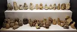 At the top of the steps is a statue of Cybele enthroned, with a turreted crown and lion attendants. This is consistent with a colossal, fragmentary statue of the goddess, found within the temple precincts. The goddess' meteoric stone may have been kept on a pedestal within the temple cella; or incorporated into the face of a statue and set on a pediment.[4] This stone was known as the acus Matris Deum or the needle of Cybele, described by Servius as being "conical in shape, of a deep brown color" with the appearance of molten rock and sharp to a point.[5] This acus is identified by Servius as a pignora imperii, one of the seven sacred objects which maintained imperial rule.[6]