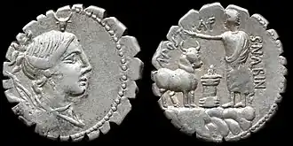 | Silver serrate denarius struck by A. Postumius A.f. S.n. Albinus in Rome 81 BC.