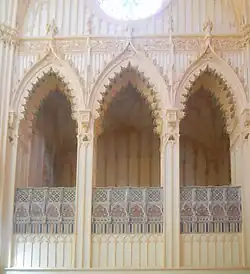 The main nave, compared to the two smaller ones, in addition to the sixth bay (which, compared to the previous ones, is shallower as it corresponds to the ancient apse of the thirteenth-century church) has another one, formerly used as a presbytery, whose floor is placed at a higher level than the hall and is connected to it by a series of steps. The room, covered with a cross vault decorated with the coats of arms of the royal family, is lit not by two single-lancet windows, but by two rose windows, below which open, with three pointed arches, two women's galleries: the one on the left, with independent access from the outside, was used as a royal box, while the one on the right (destroyed by a bomb during World War II, on September 8, 1943, and later rebuilt without, however, restoring its decorations) as a chancel.[42]