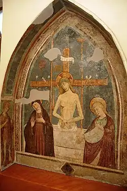 From the refectory of the convent comes a fresco currently detached and exhibited together with its sinopia in the Diocesan Museum and of the Religiousness of the Aurunci Mountains Park in Gaeta, the only surviving piece of a larger wall decoration of the room and datable to around 1470; it is the work of Giovanni di Gaeta and bears strong similarities to two other panel paintings by the local painter, the coeval Pietà among angels from the church of Santa Maria in Piazza in Fondi and the Shaped Crucifix from the former church of Santa Lucia in Gaeta, dating from the 1460s. The fresco originally adorned an ogival niche and features Christ in Pietà between the Madonna and St. John the Evangelist on the wall, while of the two figures on the intrados only the one on the left with St. John the Baptist remains.[48]