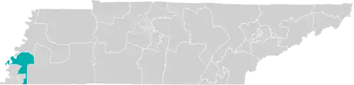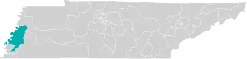 The district is located almost entirely within Tennessee's 8th congressional district, with a small section extending into the 9th district. It overlaps with the 81st, 83rd, 88th, 95th, 97th, 98th, and 99th districts of the Tennessee House of Representatives,[4] and borders the states of Mississippi and Arkansas.[1]