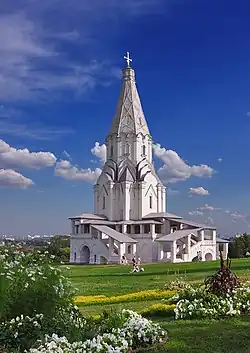 The Ascension church of Kolomenskoye, built in 1532 to commemorate the birth of the first Russian tsar, Ivan IV, is often considered to be the first tented roof church built in stone. However, Zagraevsky has argued that the earliest use of the stone tented roof was in the Trinity Church in Alexandrov, built in the 1510s.[4]