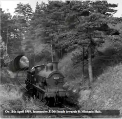 St. Michael's was little more than a halt station consisting of no more than a single platform made of sleepers and, for some time, a small corrugated iron hut which served as a ticket office.[5] So modest were the facilities that the wooden picket gate leading from the road for the use of passengers has been described as "more obvious than the halt itself".[6] By August 1938, the ticket office had closed and passengers were obliged to purchase their tickets on the train; the station had also become run-down and the track weed-strewn. It had fallen into a dangerous and decrepit state by 1953, the condition of the platform sleepers having seriously deteriorated.[7] Regular passenger services on the line were withdrawn after the last train on Saturday 2 January 1954.[8] The line was engineered and operated by Colonel H F Stephens. The only tunnel on the line the 31 yards long "St Michaels Tunnel" was located just north of the halt.[9]