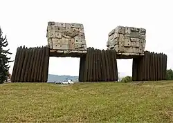 Terra Incognita, designed by Ilan Averbuch, was installed at North Broadway and North Larrabee Avenue, at the foot of the Broadway Bridge, in Portland's Rose Quarter in 1995. The gate-like sculpture is made from steel, wood, stone and copper, and measures 15 feet (4.6 m) x 40 feet (12 m) x 6 feet (1.8 m).[1][2] It forms five cubes in a "strong positive negative pattern".[2] The three base cubes are bundled tree trunks, and the two cubes suspended by the lower three are stone piles. According to the Regional Arts & Culture Council, which administer the sculpture: