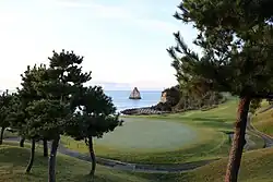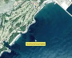Terushima Cormorant Habitat (照島ウ生息地, Terushima U Seisokuchi) is located in Shimokawa, Izumi-cho, Iwaki, Fukushima Prefecture, and is a habitat for Japanese cormorants designated as a national natural monument.[1][2] Terushima is a small island made of tuffaceous sandstone with a cliff of 31 meters in height, located approximately 250 meters offshore from the coast of the mainland.[3][4] It was designated as a national natural monument on February 22, 1945, under the third category of the designation criteria for animals: "animal or animal group unique to the natural environment."