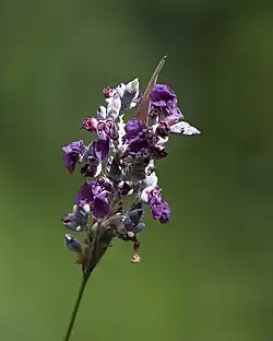 Thalia dealbata, the powdery alligator-flag,[2] hardy canna, or powdery thalia, is an aquatic plant in the family Marantaceae, native to swamps, ponds and other wetlands in the southern and central United States.[3][4] Its range includes much of Coastal Plains and the lower Mississippi Valley (States of South Carolina, Georgia, Alabama, Mississippi, Louisiana, Texas, Oklahoma, Arkansas, Missouri, Illinois and Kentucky).[5] The plant has been grown as an aquatic ornamental because of the pretty violet flowers, and in cultivation has been proved hardy as far north as Philadelphia (Pennsylvania) and Vancouver (British Columbia).[6][7][8]