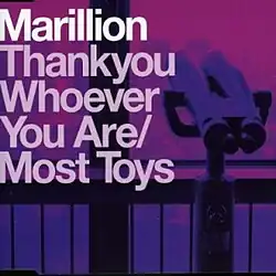 "Thankyou Whoever You Are" and "Most Toys" are songs recorded by British neo-prog band Marillion which appeared on their 14th studio album, Somewhere Else. They were released on a double A-side single in the United Kingdom and in the Netherlands in June 2007. "Thankyou" is a slow, slightly orchestral ballad arranged in the band's trademark style. In stark contrast, "Most Toys" is simple, rocky and fast, with an anti-consumerism message. It has a running time of 2:49, one of the band's shortest recordings to date, along with the musically similar "Hooks in You" from 1989).