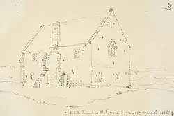The rectangular Blue Lias stone building has a stone tiled roof. It is 12.4 metres (41 ft) long and 6.6 metres (22 ft) wide.[3] The ground floor had three rooms, one larger than the others which had a fireplace, and a door in the southern wall.[3] The larger room was the hall and linked by arched doorways to the smaller rooms.[21] There were two rooms on the first floor, which were damaged in the fire of 1884, which also has a small entrance door which was accessed via exterior stone steps which no longer exist. There was also a latrine in a turret which no longer exists.[21] There are small traceried arched windows.[2]