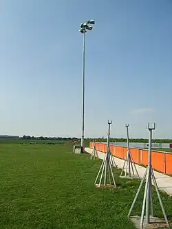 The Airfield is noted in Welsh football for having retractable floodlights due to the ground being located close to a working runway at Hawarden Airport.[3] Steve Williams, chairman of the Football Association of Wales, stated that he wanted the Wales national football teams to play more international matches in north Wales. The Airfield was suggested as a location for friendlies. The Airfield, however, does not meet UEFA standards, meaning the only international ground in north Wales is the Racecourse Ground in Wrexham.[4] Due to failing to meet UEFA standards, Airbus UK Broughton also have to play their home UEFA competition matches away from The Airfield.[5]