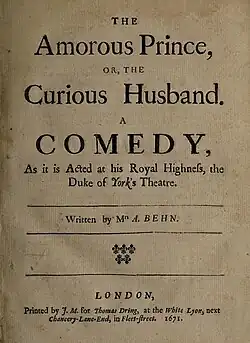 The Amorous Prince, or The Curious Husband is a Restoration comedy written by Aphra Behn and first performed in 1671. It was her second play and represents an early example of her bold exploration of gender roles, sexuality, and power dynamics in 17th-century England. Despite its initial performance, the play fell into obscurity for centuries until recent revivals brought it back to public attention.[1]