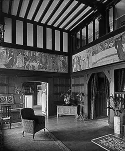A fire in around 1977 burnt the main hall's minstrels' gallery and a set of murals, The Hunt and Feast, by Fred Davis.[1][3] Other interior fittings include metal work by a member of the Bromsgrove Guild, possibly Benjamin Creswick, and embroidery by Mary Newill, who also made stained glass for some of the windows.[1]