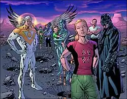 The Authority, as featured on the cover for the Under New Management trade paperback (Nov. 2000). From left to right, the Doctor, Swift, Apollo, Jenny Sparks, Midnighter, the Engineer, and Jack Hawksmoor, with the infant Jenny Quantum at the back. Art by Frank Quitely.