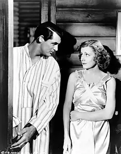 Nearly every day during principal photography, Leo McCarey would arrive in the morning with ideas for the film written down on scraps of paper.[26][74][r] On days when he had nothing in mind, McCarey would arrive on the set and play the piano until inspiration struck. He would then have the script girl write down his ideas or dialogue, and give the actors their instructions.[31][s] Although he asked the cast to rehearse scenes, McCarey also encouraged his actors to improvise and build up the scene on their own. At times, McCarey himself acted out bits with the performers.[26][t] McCarey continued to meet with screenwriter Viña Delmar every evening,[91] sitting with her in a parked car on Hollywood Boulevard and improvising scenes for her to write down.[18][44] McCarey also relied for dialogue on writer Sidney Buchman, who had joined Columbia in 1934 and who had written Theodora Goes Wild for Irene Dunne.[92] Some of the best lines and comic moments in the film remained improvised, however.[27] For example, McCarey himself came up with the idea of arguing over a dog rather than property.[93] Another example occurs when Cary Grant appears at Lucy's apartment while she is meeting for the first time with Dan Leeson. The writers did not have a line of dialogue for Grant, who ad-libbed the line, "The judge says this is my day to see the dog."[77][94][95] Grant and Dunne also came up with the idea for Jerry to tickle Lucy with a pencil while Dan Leeson is at Lucy's door.[96] Grant quickly became an accomplished improvisational actor during the shoot. He ad-libbed with such speed and composure that his co-stars often "broke character".[94]