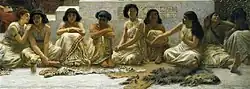 The foreground of the painting contains a line of Babylonian women who are seated and are facing the painting's audience.[11] These women are brides waiting to be auctioned off on the white stone stepped pedestal featured in the middle ground of the painting.[11] Upon this pedestal the first bride is currently being auctioned; she is displayed for purchase by another darker-skinned woman.[17] To their left stands an auctioneer, presenting the woman to be sold.[18] In the background of the image a crowd of men has gathered and is engaged in bidding on the women.[10][19] The crowd features men that appear to come from different wealth levels and classes, and they are consumed by an array of different activities.[19] Bohrer notes that the underlying event and subject of depiction is the alteration of women into commodity through the process of the market place sales system.[11]