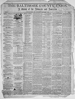 The Baltimore County Union was a weekly newspaper published in Towsontown, Baltimore, Maryland from January 7, 1865 to June 8, 1912.[1] When John H. Longnecker combined his pro-Union paper, the Baltimore County American, with the Baltimore County Advocate to create The Baltimore County Union,[1] he placed his sons Henry and John in charge of the new weekly. Its inaugural issue claimed that it had the "largest circulation of any county paper in the State."[1] The publication's main competitor in Towsontown was the Maryland Journal, a Democratic paper run by William H. Ruby.[2]