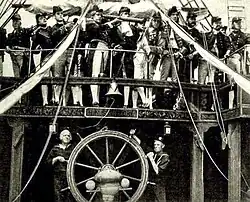 The photoplay then shifted to scenes at sea aboard HMS Victory, Nelson's flagship. It is the day before the battle and officers are writing letters, perhaps their final messages, to their families and sweethearts. Lieutenant Prescott (Herbert Prior) is shown writing his fiancée (Laura Sawyer), who appears as a vision with "beautiful scenic and photographic effect".[3] Advancing to the next day, the film depicted Nelson making a final entry in his personal diary and later on Victory bidding farewell to Captain Hardy (James Gordon) and other officers once the long line of enemy vessels is sighted on the horizon. Next, "splendidly portrayed" in the film, signal flags are hoisted aloft to relay the admiral's own simple but inspiring message to his crews across the British fleet: "England expects that every man will do his duty".[3] Scenes then transitioned to the flagship's decks being cleared for action, followed by footage showing the battle itself with "the firing of the guns", "ships caught on fire", and close-up views of the battered Victory. While the battle is raging, Nelson and Hardy are openly and calmly walking on the quarterdeck giving commands. Suddenly, Nelson drops to his knees, struck down by a musket ball shot by a sniper aboard the adjacent French warship Redoubtable. Mortally wounded, Lord Nelson is quickly carried below decks to the ship's cockpit. There in the film's final scenes, described as replete with "grandeur" and "pathos", the heroic admiral dies, but not until Hardy brings him news of the British fleet's overwhelming defeat of Napoleon's Franco-Spanish fleet.[3]