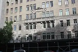 There are also nine entrances to individual offices on the ground floor: two on Central Park West, three on 81st Street, and four on 82nd Street. Each doorway contains a single door, recessed within the rusticated limestone facade. The bronze-and-glass office doors are simple in design and are topped by a bronze-and-glass transom panel.[38] On the far western end of the 81st and 82nd Street frontages, there is a short standalone wall of rusticated blocks, which contains a round archway topped by a keystone with a winged cherub's head. There is a metal service gate below each archway. The 81st Street gate contains a panel with the word "Service", and the panel above the gate is decorated with guttae.[33]
