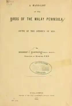 1. ^ a b Boden Kloss, C. (1928). "The Birds of the Malay Peninsula: Mr. Robinson's great book". Straits Times. January 17: 3.