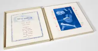 "This catalogue documents the publication of 'The Blue Guitar', a group of etchings by David Hockney, accompanied here by a poem of Wallace Stevens 'The Man with the Blue Guitar". The portfolio contains twenty etchings drawn by the artist in London in the Autumn of 1976 and Spring of 1977"[3]