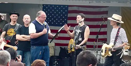 The Bongos receiving a proclamation from the City of Hoboken, September 30, 2007. From left: James Mastro, Frank Giannini, Mayor David Roberts, Richard Barone, and Rob Norris.