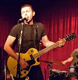 They signed to British label Fetish Records, whose artist roster consisted of largely early industrial, experimental, and post-punk groups. While in London performing at The Rainbow Theatre, Dingwall's, and trendy Cabaret Futura, the Bongos recorded their early singles and their well-received debut EP Time and the River for Fetish. Cover designs for these releases were created by influential graphic artist Neville Brody, who was soon to become the designer of The Face magazine.[2] The group's interest in avant-garde music brought them in touch with artists such as Throbbing Gristle and Clock DVA who performed with them live in London, and on their recordings. Their debut U.S. album, Drums Along the Hudson, compiled from the band's British singles, was released in 1982 to widely favorable reviews on both sides of the Atlantic. While Trouser Press suggested that the group "may trade a certain amount of substance for easy appeal," it added that "there's no better musical equivalent of whipped cream anywhere."[3] Writing in the Village Voice, Robert Christgau dryly commented that "for all their jumpy originality [the songs are] still slight, and Richard Barone's lyrics are so oblique you have to wonder what his angle is."[4] In 2007 however, Jim DeRegotis wrote in the Chicago Sun-Times: "The initial impression of naiveté is offset by deceptively simple lyrics that actually hint at deep, dark mysteries and unfathomed mystical enigmas."[5] In 1981, the group's cover of T. Rex's "Mambo Sun", written by Marc Bolan, reached No. 22 on the Billboard Dance Club Chart.[6] The thriving Hoboken pop scene, triggered by the Bongos and Maxwell's, gained national media attention, and drew many bands and fans to the city. An August 1, 1982 article in the New York Times Real Estate section hinted at the scene's popularity as an influence on increasing rents and property values.[7]