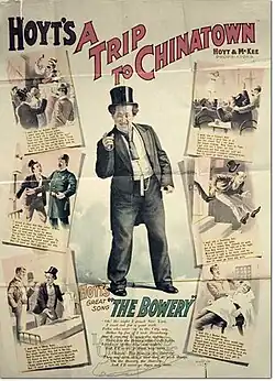 The producer/playwright/lyricist Charles H. Hoyt (1849–1900) collaborated on at least 11 musicals with conductor/composer Percy Gaunt (1852–1896).[5] Hoyt, who has been called the Father of American Farce,[6] developed a style in his musicals based upon fast action, outrageous situations, witty dialogue, dancing, acrobatics, and singing. The meager plot of A Trip to Chinatown did not remain constant during its long run but varied with changes in novelty acts, songs, characters, and lines.[6] One constant was The Bowery, which had been interpolated initially to shore up the musical's appeal.[7] The strategy proved successful, and The Bowery became a major factor in the show's success.[7] It was introduced on Broadway by comic Harry Conor.[7] A Trip to Chinatown ran for 650 performances and set a Broadway record that stood for 20 years.[6] The Bowery sold more than 1 million copies of sheet music and has remained a familiar song.[8]