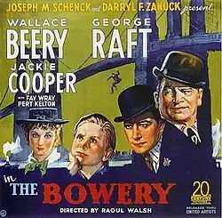 The Bowery is a 1933 American pre-Code historical comedy-drama film set on the Lower East Side of Manhattan around the start of the 20th century directed by Raoul Walsh and starring Wallace Beery and George Raft. The supporting cast features Jackie Cooper, Fay Wray, and Pert Kelton.