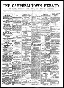First published on 14 February 1880 by William Webb,[1] The Campbelltown Herald was published between 1880 and 1919. It was the first paper published in the Campbelltown area.[2] Early editions of the paper bore the banner title The Campbelltown Herald and Camden, Liverpool, Appin, Picton and Menangle Advertiser.[3] On 30 March 1898, the banner title of the paper carried the sub-heading "with which is incorporated The Campbelltown Liberal".[4]