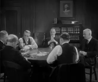 Philo Vance and all the film's major suspects during a poker scene—clockwise, the characters seen are Philo Vance, Charles Spottswoode, Louis Mannix, Dr. Ambrose Lindquist, John Cleaver, and Jimmie Spottswoode