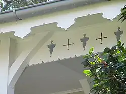 The timber components were reputedly numbered with "code markings like roman numerals" as was common practice.[3]: 47  Dowel fixings were used. The extent to which evidence of this construction has survived has not been determined. Photographs of the exterior of the building show that the prefabrication is evident in the sidewalls. The veranda appears to have its own structure, with cross bracing to the supporting posts and into the front walls of the house, an unusual detail for Australia. The outer layer of fretwork to the veranda conceals the ends of the rafters, a practical detail that protects them from water entry.[1]