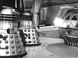 Four of the Daleks owned by the BBC were refurbished, costing £118; of this, the Publicity Department, which had been using the props extensively for promotional purposes, paid £100.[27] Cusick disliked the modifications made on the Dalek casings by Spencer Chapman on The Dalek Invasion of Earth; Cusick redesigned the casings, removing the fenders and power dishes and adding shoulder slats to the midriff section.[19] The black Dalek Supreme from The Dalek Invasion of Earth was painted silver for The Chase.[24] Cusick also designed a lightweight prop, referred to as a "hover Dalek", which could appear to move rapidly over the sands; it was operated by Gerald Taylor.[30] For the final shot of the first episode, Cusick and his team buried a Dalek in the sand and attached it to a Land Rover vehicle via rope; however, the casing did not rise through the sand, forcing the team to reconsider the effect. Cusick and Shawcraft Models ultimately built an 18-inch Dalek puppet operated from underneath.[31] Cusick designed the Daleks' control room from pieces of sets from The Daleks and The Dalek Invasion of Earth.[32] The Dalek ship in the third episode was populated by several Dalek props, including three unoccupied casings from the film Dr. Who and the Daleks (1965).[33][27] Martin contacted the film's writer and producer Milton Subotsky and asked to borrow some of the casings built for the movie, which had recently completed production; Subotsky offered Martin eight Dalek props, but as they were noticeably different from their television counterparts, three were used in the background to populate the shots.[34]