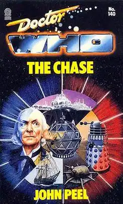 A novelisation of this serial, written by John Peel, was published by Target Books and W. H. Allen & Co. in 1989 after lengthy negotiations.[95] Peel restored most of Nation's original ideas in the novelisation, as many of the original changes had been due to timing and budgetary reasons rather than artistic ones.[96] The cover was designed by Alister Pearson. The original print of the book was limited to 24,000 copies. Target reissued the novel with a slightly revised cover in July 1991. An unabridged audiobook of the novelisation, titled Daleks: The Chase, was released in August 2011 by AudioGO; it is narrated by O'Brien, with Dalek voices by Nicholas Briggs, and uses Pearson's cover art.[95] The audiobook was reissued in Doctor Who: Dalek Menace! by AudioGO in October 2012.[94][95]