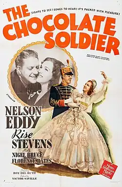 The Chocolate Soldier is a 1941 American musical film directed by Roy Del Ruth. It uses original music from the Oscar Straus 1908 operetta of the same name, which was based on George Bernard Shaw’s 1894 play Arms and the Man.[2] Unable to come to terms with Shaw, the studio used a story to which it already had rights:[3][4] the Ferenc Molnár play The Guardsman (originally Testőr). The plot centers on the romantic misunderstandings and professional conflicts between two recently married opera singers, played by Metropolitan Opera star Risë Stevens (in her film debut)[5] and Nelson Eddy, who perform excerpts from the operetta during the film. This screenplay was written by Leonard Lee and Keith Winter. The Guardsman—a huge hit on Broadway in 1924— was brought to the screen in 1931, with Alfred Lunt and Lynn Fontanne reprising their stage roles as married actors.