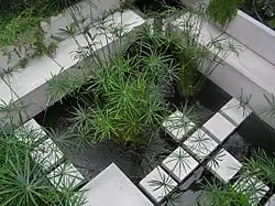 The chapel consists of an 8.2 m (26 ft 11 in) concrete cylinder surfaced with a layer of patinaed bronze. On one side of the cylinder is a pyramidal glass greenhouse that houses a below-ground koi pond decorated with live plants, a small waterfall, and concrete blocks that serve as stepping stones.