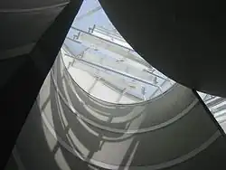 The chapel itself occupies nearly all of the ground floor of the building and is accessed through a tall metal door from the greenhouse. The interior is a two-story stone cylinder with several semi-circular concrete constructions scalloping the walls. At the top of the cylinder are thin windows with several long prisms designed by the artist Charles Ross that create raking light and occasionally rainbows across the austere concrete interior.