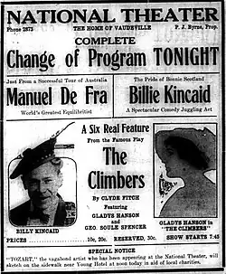The Climbers is a lost 1915 silent film produced by the Lubin Manufacturing Company and starring Gladys Hanson;[1] it is the first filming of Clyde Fitch's 1901 play of the same name.[2][3][4] Later versions of Fitch's play were made in 1919 as The Climbers with Corinne Griffith and in 1927 also as The Climbers with Irene Rich.