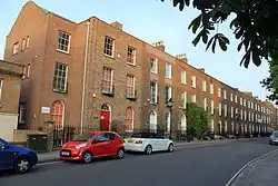 On the eastern side of The Crescent, a Georgian terrace was erected in 1807. Built of "pinkish-brown" brick, each house is of three-storeys plus a basement, and is two windows across. The houses are split by plain pilasters and topped with hipped slate roofs. While the first and second storey windows are rectangular, those on the ground floor are round-headed, as are the doorways. The first floor windows have small, circular segmental balconies. A variety of six- and eight-panel doors are reached by climbing a small flight of steps, and the entire terrace is fronted with railings. This terrace forms two separate listed building designations from Historic England; numbers 1–11 and 15–20, both of which are Grade II* listed.[15][16]