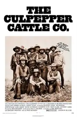 The Culpepper Cattle Co. or Dust, Sweat and Gunpowder (Australian title) is a 1972 American revisionist Western film produced by Twentieth Century Fox. It was directed by Dick Richards and starred Billy Green Bush as Frank Culpepper and Gary Grimes as Ben Mockridge. This was the first credited film for Jerry Bruckheimer, for which he received an associate producer credit.[3] Its tagline is "How many men do you have to kill before you become the great American cowboy?" and also "The boy from Summer of '42 becomes a man on the cattle drive of 1866", which references a similar coming of age film starring Gary Grimes. The film is typical of the "hyper-realism" of many early 1970s revisionist westerns. It is particularly noted for its grainy photography and use of sepia toning in some scenes.[4]