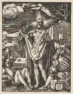 The soldier supporting himself on his hands, perhaps in the act of getting up, is similar to a semi-recumbent figure in the left foreground of Caravaggio's Martyrdom of Saint Matthew installed in the Contarelli Chapel, Rome in July 1600; early enough for Ter Brugghen to have known it during his sojourn in the Eternal City no later than 23 April 1607 when he is placed there by Utrecht records.[7] The second soldier, to the right, is taken from The Resurrection of Christ from Albrecht Dürer's Small Passion.[8]