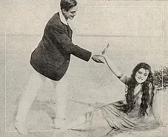 Film still of Lucio (Doucet) meeting Gioconda (Bara) for the first time on a beach, where she was "half-clothed" and dancing by herself[7][8]