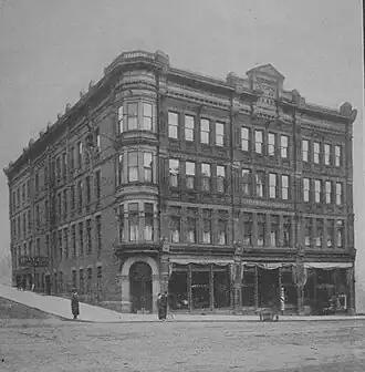 The Diller Hotel is a former hotel building in downtown Seattle, Washington. In the early 1900s, it was known as one of Seattle's few luxury hotels. This historic building is located at the corner of First Avenue and University Street, across from the Seattle Art Museum, and is one of the few remaining buildings left from the 1890s, a period of reconstruction and commercial development after the area was destroyed by the fire of 1889. The hotel was owned by Leonard Diller (1839–1901) and family and was designed by architect Louis L. Mendel.[1] The building is now home to The Diller Room, a craft cocktail bar housed in the former hotel lobby.