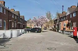 A view of Union Road in The Dings, looking northwest. The pedestrianisation of the roads as part of the home zone is clearly visible.
