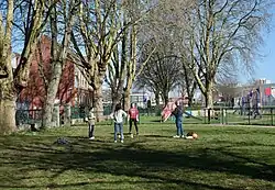 The Dings Park includes lawns suitable for informal sports games and a fenced playground that includes climbing frames and other play equipment.