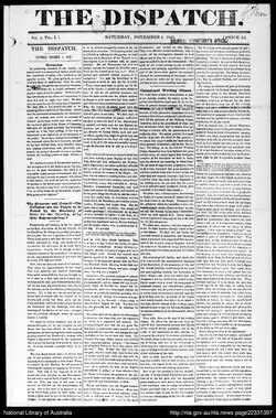 No. 1, Vol. 1 of The Dispatch was published on Saturday, November 4, 1843. The paper was printed and published at the Office, Harrington Street, by G. O'Brien. The aim of the paper was to "carefully watch the public interest, to carefully guide the public opinion".[1] The paper ceased publication with Vol. 2, no. 61, December 28, 1844.[2][3]