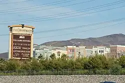 The project, known as The Shops at Green Valley Ranch, received final city approval in December 2002.[6] The city's zoning codes had to be altered to allow for the project to proceed. It was designed by Perlman Architects,[7] with McCarthy Building Companies as the general contractor.[8][9] Construction on the $80 million project was underway in early 2003.[10] The project's location was considered desirable, being situated beside the Las Vegas Beltway.[11][12] In March 2004, a name change was announced: The District at Green Valley Ranch. The new name was chosen to reflect the project's wide array of features other than shopping.[11][13]