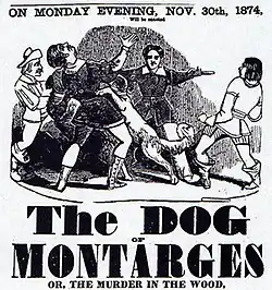 The Dog of Montargis, or Murder in the Wood was a 19th-century melodrama, based on the tale of Robert Macaire and his trial-by-combat with a dog. It arose from the Parisian actor and theatre director René Charles Guilbert de Pixérécourt and premiered on 18 June 1814 as Le Chien de Montargis, ou la Forêt de Bondy, mélodrame historique en trois actes et à grand spectacle at the Parisian Théâtre de la Gaîté on Boulevard du Temple, where it had an uninterrupted run in that theatre's repertoire until 1834. Like many melodramas, it had several English-language adaptations. John Fawcett, manager of the Theatre Royal, Covent Garden, applied on September 17, 1814 for a license to present a two-act adaptation by William Barrymore, originally titled Murder Will Out with the alternate and more commonly used title The Dog of Montargis, or, The Forest of Bondy. The first performance was September 30, 1814.[1] Other adaptations followed, including an 1816 three-act version attributed to Sir Henry Bishop,[2] and a two-act version by Thomas Dibdin.[3] Versions were performed at many playhouses in London and in the United States throughout the nineteenth century.