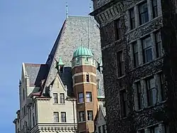 Designed in a Chateauesque-style, The hotel features steep pitched roofs, gables, and polygonal turrets.