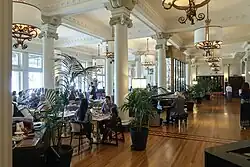 A number of rooms at The Empress are also used by restaurants and other food-based services. Restaurants located within the restaurant include the Lobby Lounge, Q at the Empress Restaurant, and the Q Bar.[11] The restaurants were all redesigned in 2017 by the Puccini Group, a San Francisco-based interior design firm. The restaurants features a purple, hardwood floor, and textured-fabric chandeliers.[11] The hotel's afternoon tea service is held at the Lobby Lounge.[11]